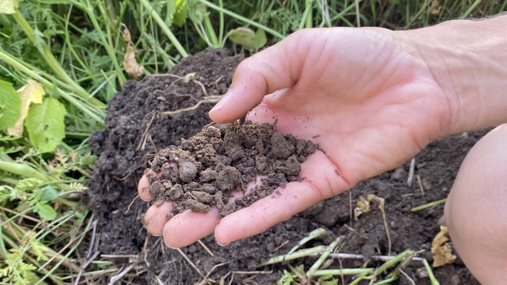 Den Einsatz von Kunstdünger konnten wir seit der Umstellung stark verringern. Die Kombination aus permanenter Bodenbedeckung, dem Einsatz von Tieren und weiteren Massnahmen führte dazu, der Boden selbst in der Lage ist, mehr Stickstoff zur Verfügung zu stellen.